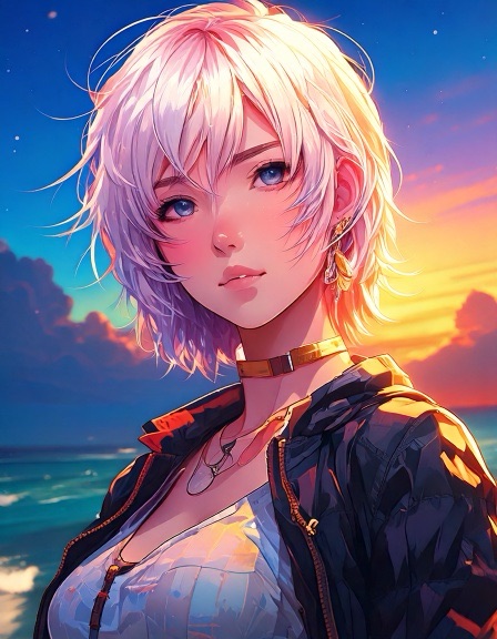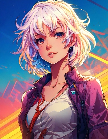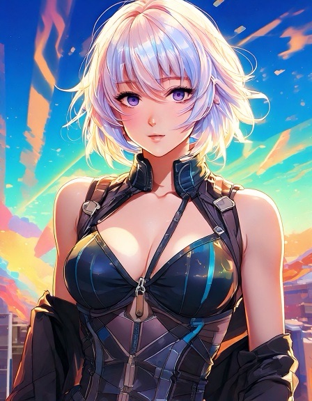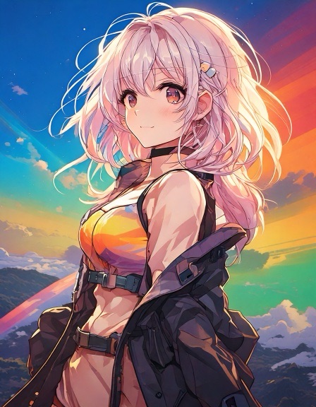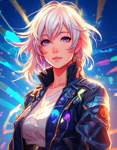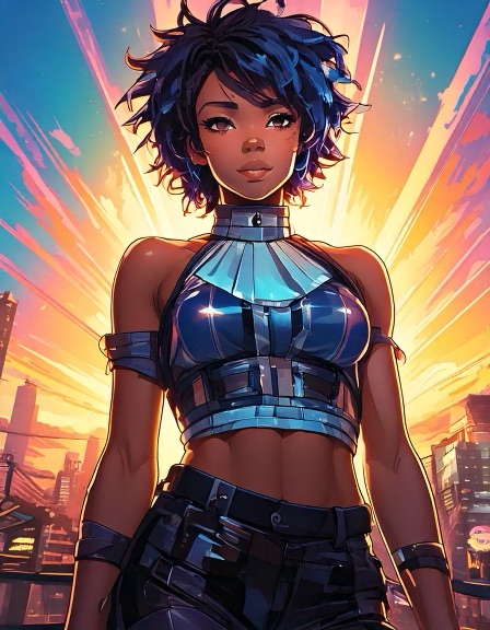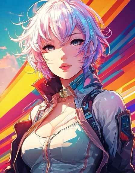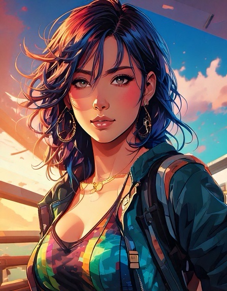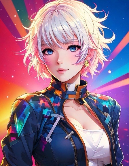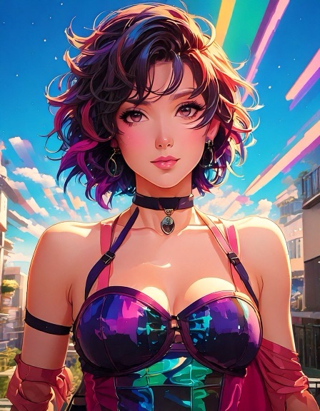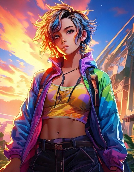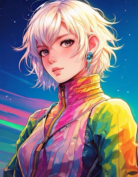 Ash: Genderfluid model in glanzend jumpsuit met abstract patroon dat verandert van kleur afhankelijk van lichtinval. Pose: nonchalant verleidelijk, zoals een karakter uit een futuristische shojo manga. Ravi: Jong, gespannen maar nieuwsgierig. Draagt een te grote regenbooghoodie over een sobere jeans. Zijn verwarring is zichtbaar als een zachte blos. Sora: Theatraal, flamboyant. Haar stijl is een mix van traditionele Japanse kimono en cyberpunk couture, met waaiers van neonstof.