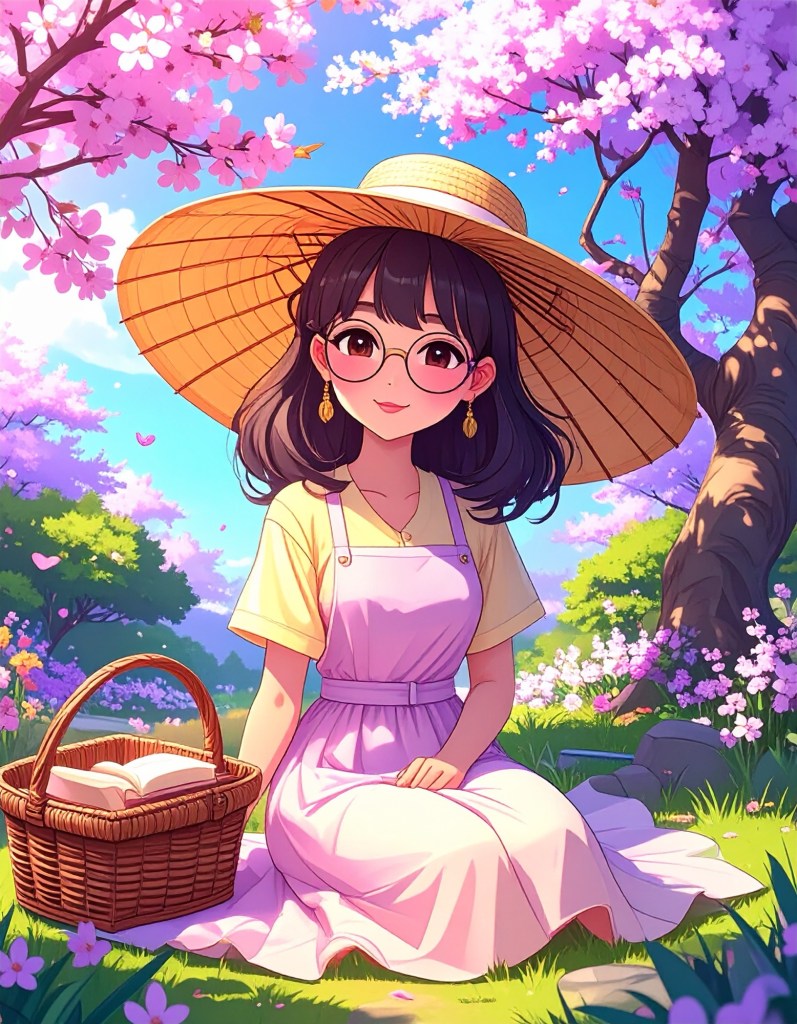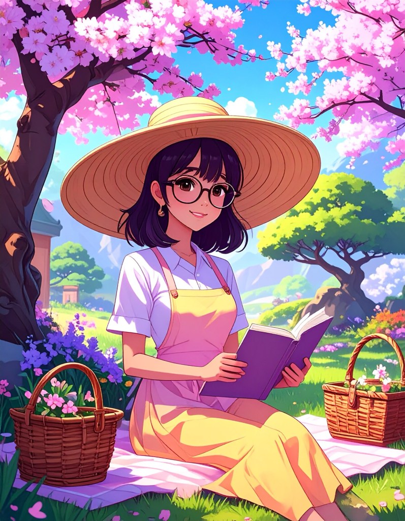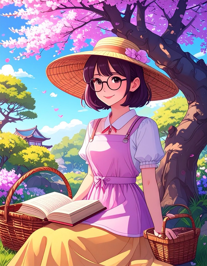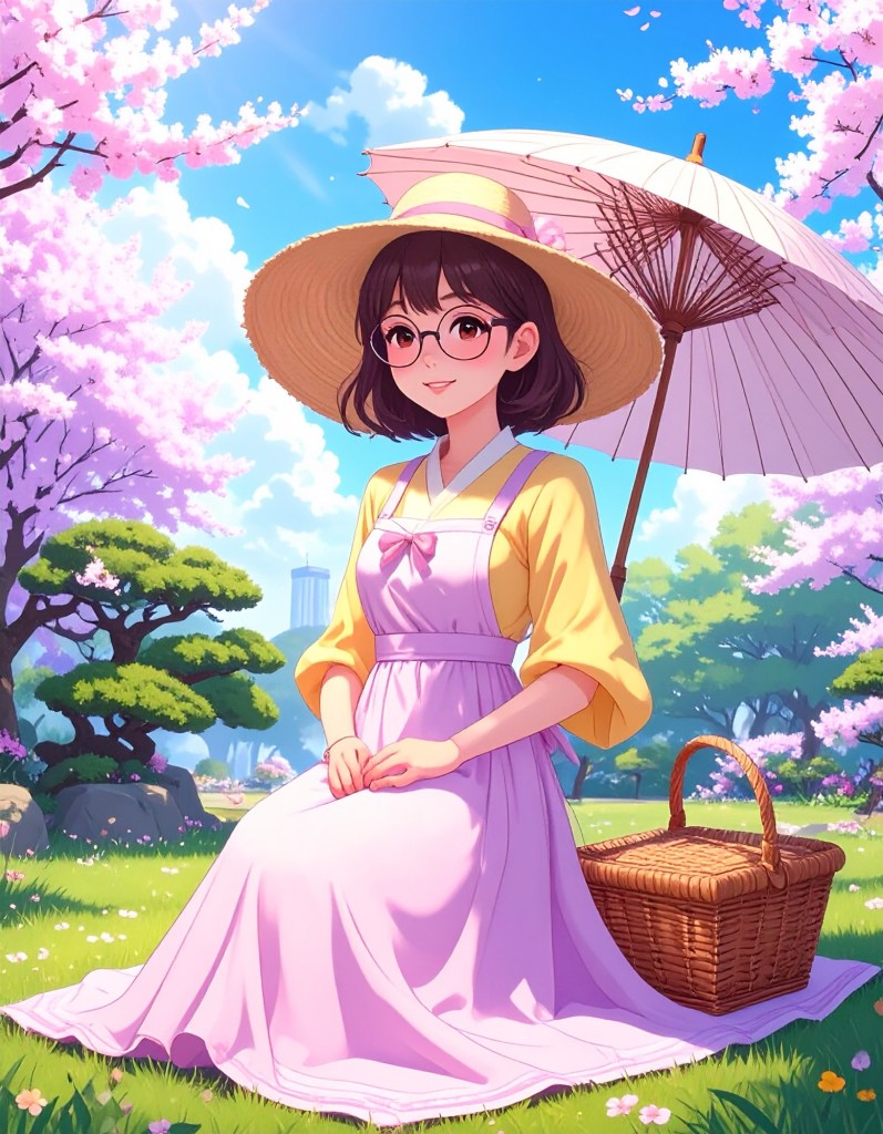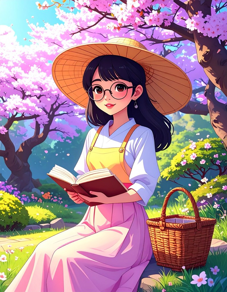 - Pastel Hues Implied: Sun-dappled light, pink blossoms, soft greens, glowing golds.